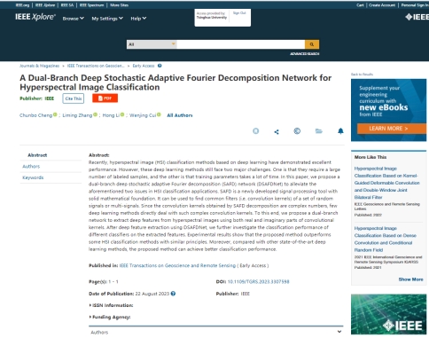 (通讯员崔文静)近日,遥感领域国际顶级期刊IEEE Transactionson Geoscience and Remote Sensing(IEEE TGRS, SCI一区, 影响因子8.2)发表了我校数理学院“数据挖掘及建模”团队题为“A Dual-Branch Deep Stochastic Adaptive Fourier Decomposition Network for Hyperspectral Image Classification”的研究成果。太阳集团为第一署名单位,成纯波博士为论文的第一作者。