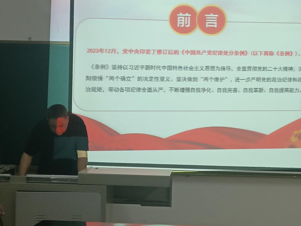 首先,石大为同志结合警示案例,对新修订的《中国共产党纪律处分条例》第八章 “对违反廉洁纪律行为的处分” 有关内容进行了领学,教育引导党员教师以案为戒,进一步树牢“底线”思维和“红线”意识,紧绷廉洁从教之弦。