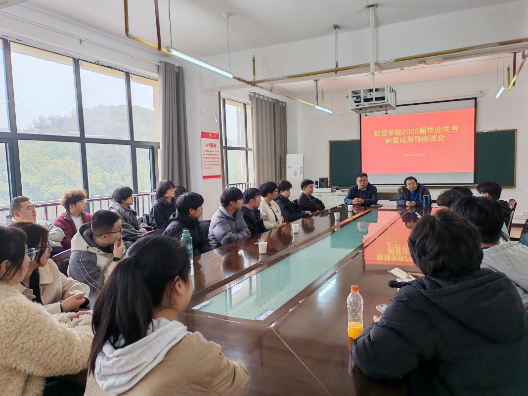 (本网消息)2月28日下午,数理学院在智慧大楼三楼会议室召开“2025届毕业生考研复试指导座谈会”。院长余宏生、副书记胡先凯、熊宏伟教授出席会议,学院30余名考研学生到场参加。会议由院长余宏生主持。