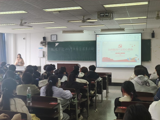 为进一步提高大学生的责任感与使命感,数理学院于2024年3月28日在J3-302开展以“不忘初心,牢记使命”为主题的团课学习活动。本次团课由数理学院黄麟喻辅导员进行授课,参与人员为2022级、2023级部分学生。