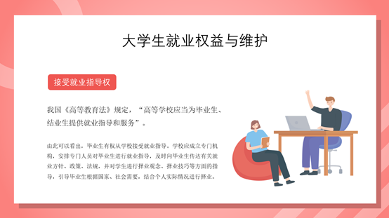 第二部分则是告诉同学们在求职过程中保护好自己的人身安全和财产安全,多听,多看,遇到相关问题,要敢于向有关部门反映;在签订协议书前一定要对其内容反复斟酌,方可落笔。最后一个板块则是在校大学生享有自由选择职业的权利,学校应对其进行帮助,提供有效信息。毕业生有全面获悉用人单位信息、了解用人单位的工作环境、福利待遇、发展前景等情况的权利。在求职之前应该进行充分了解。