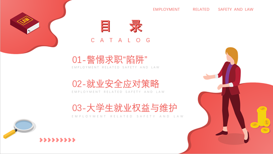 通过三个板块,让毕业生们更好的学习到有关就业的相关知识。首先通过求职可能会出现的“陷阱”,如“试用期”、无书面协议等进行引入,提醒同学们需要深入了解劳动法相关法律,如果权益受到侵犯,勇敢的拿起法律进行维权。
